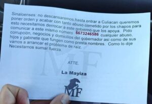 Culiacán. Mientras el gobernador de Sinaloa Rubén Rocha Moya afirma que no pasa nada en su entidad, hoy desde una avioneta lanzaron volantes firmados por «La Mayiza» donde piden a la población denunciar abusos de los «Chapitos» con referencia al gobierno.
