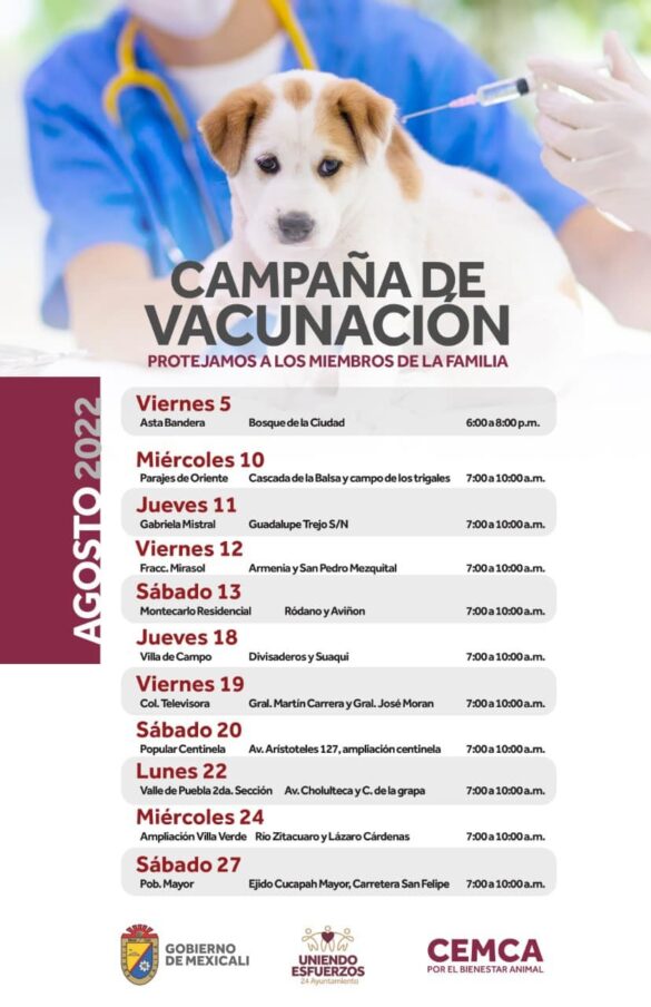 ANUNCIAN FECHAS Y SEDES DE LA CAMPAÑA DE VACUNACIÓN ANTIRRÁBICA DEL MES DE AGOSTO