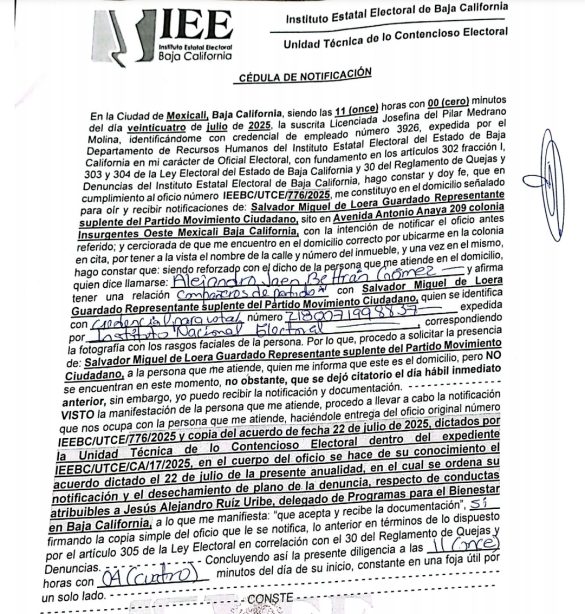 Mexicali. La Unidad Técnica de lo Contencioso Electoral del Instituto Estatal Electoral de Baja California abordó una denuncia contra Jesús Alejandro Ruiz. La denuncia la presentóEl Partido Movimiento Ciudadano, quien denunció que desde el 28 de junio de 2025 aparecieron espectaculares en Mexicali y Tijuana…