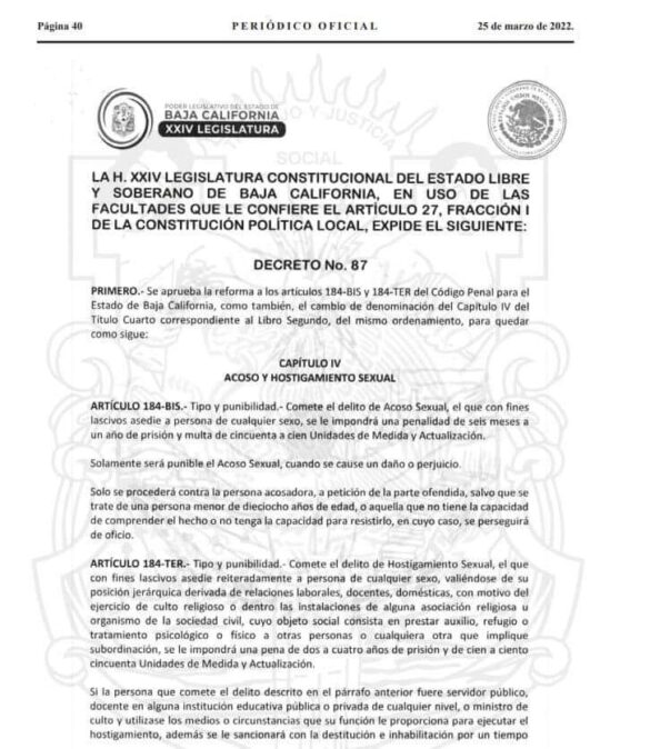 Es oficial, el acoso y hostigamiento sexual ya es un delito, al ser publicada la reforma en el Periódico Oficial del Estado de Baja California. El decreto 87 reformó el Código Penal del Estado tipificó que es delito el acoso con fines lascivos, y cuando…