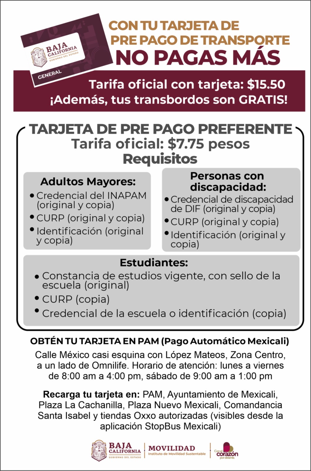 IMOS anunció que a partir del próximo viernes 26 de julio entrará en vigor un nuevo esquema tarifario mediante el cual se conservará la misma tarifa de transporte de 15.50 pesos para quienes utilicen tarjeta de pre pago, así como pago mediante código QR, que puede generarse mediante la aplicación digital Stopbus Mexicali. También conservarán la tarifa preferencial de 7.75 pesos los estudiantes, adultos mayores y personas con discapacidad, con su tarjeta de pre pago preferente. Sin embargo, para los pagos en efectivo, se aplicará la tarifa de 20 pesos y 21 pesos en el verano.
