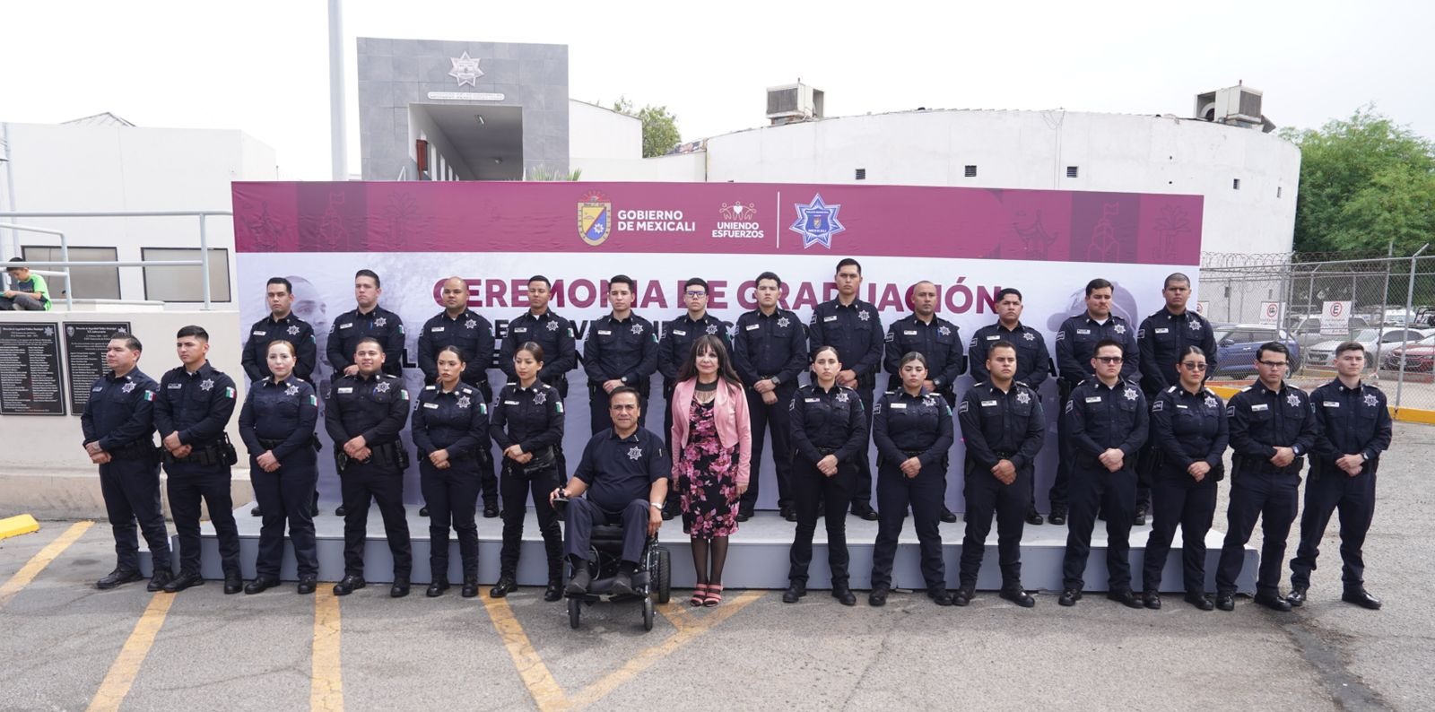 Mexicali, B.C. A 14 de abril 2025.- Norma Bustamante, alcaldesa de Mexicali encabezó la ceremonia de graduación de la Generación LVI, conformada por 25 nuevos elementos de la Dirección de Seguridad Pública Municipal (DSPM).