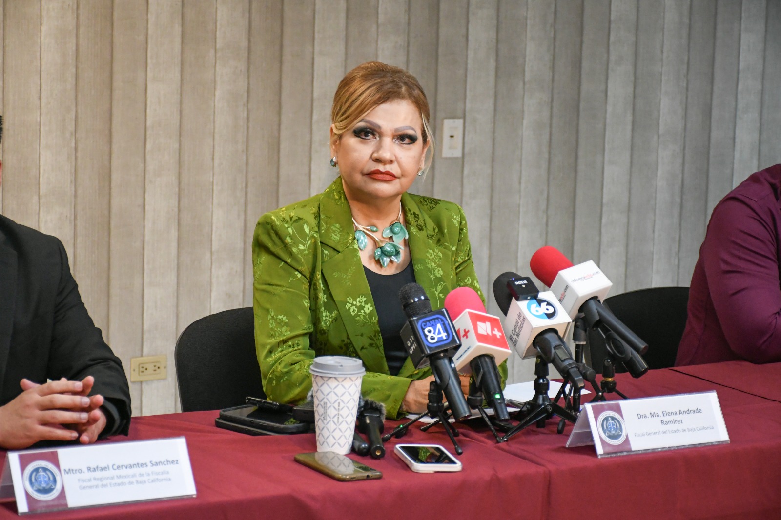 MEXICALI. La Fiscal General del Estado, Ma. Elena Andrade Ramírez, presentó ante medios de comunicación resultados de investigaciones, en donde destacó el esclarecimiento de homicidios recientes.