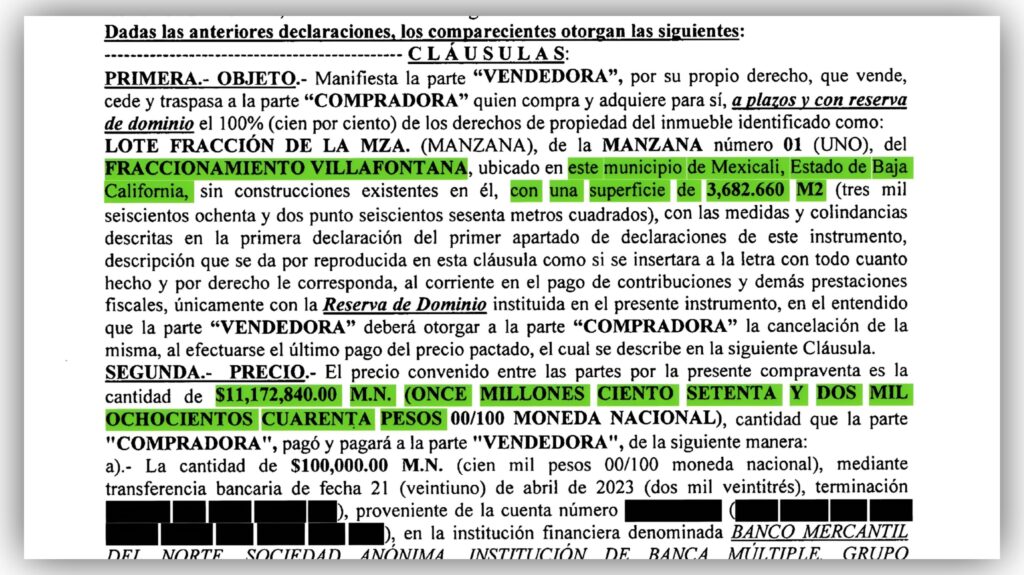 El contrato de compraventa, firmado en junio de 2023, estableció un monto total de 11 millones 172 mil 840 pesos. El pago se distribuyó de la siguiente manera: