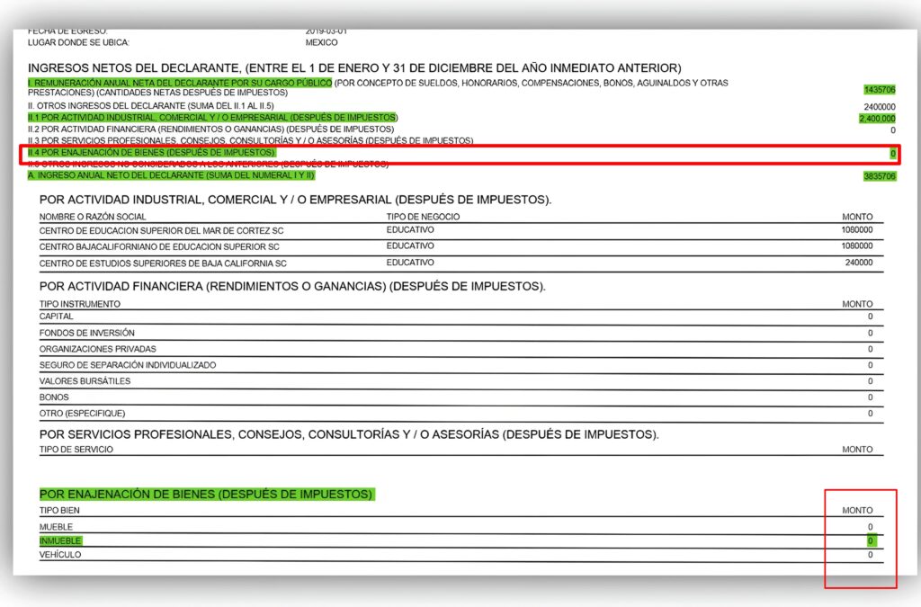 En la misma declaración reportó 1 millón 504 mil 38 pesos como ingreso anual por su cargo y 2 millones 940 mil pesos por actividades privadas. No informó sobre los más de 11 millones recibidos por la venta del terreno.